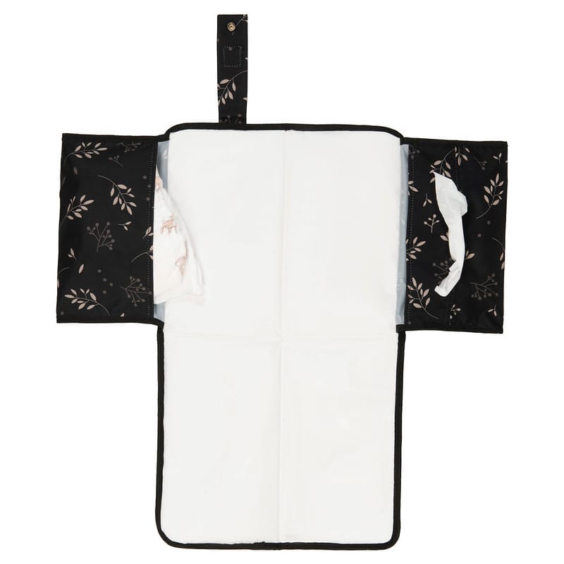 Het zwarte design met subtiele bladerenprint (“Romantic Leaves Black”) oogt rustig en stijlvol, waardoor het ook fijn is als vaste verschoningsset in je tas.