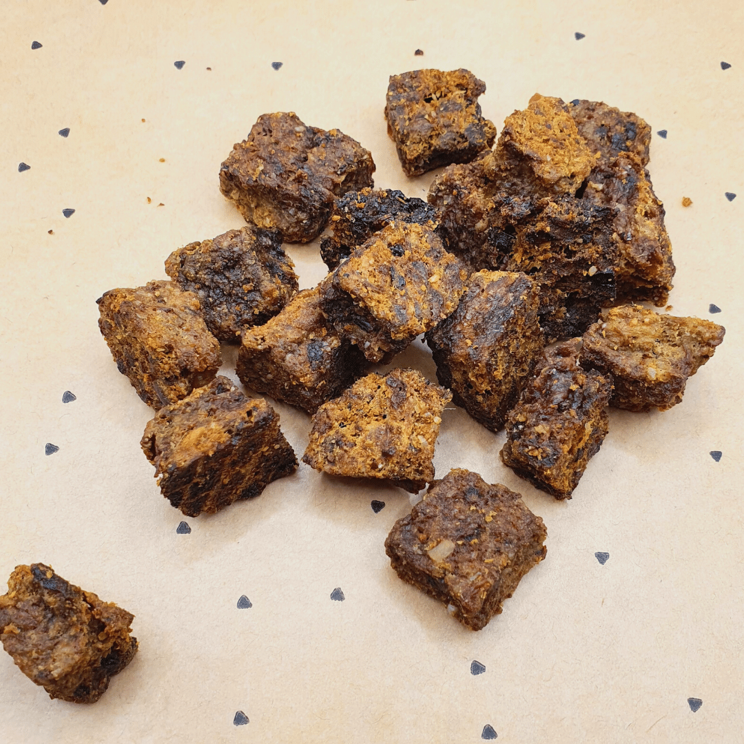 De hertenvlees snacks hebben een grootte van ongeveer 1,5 cm x 2 cm.