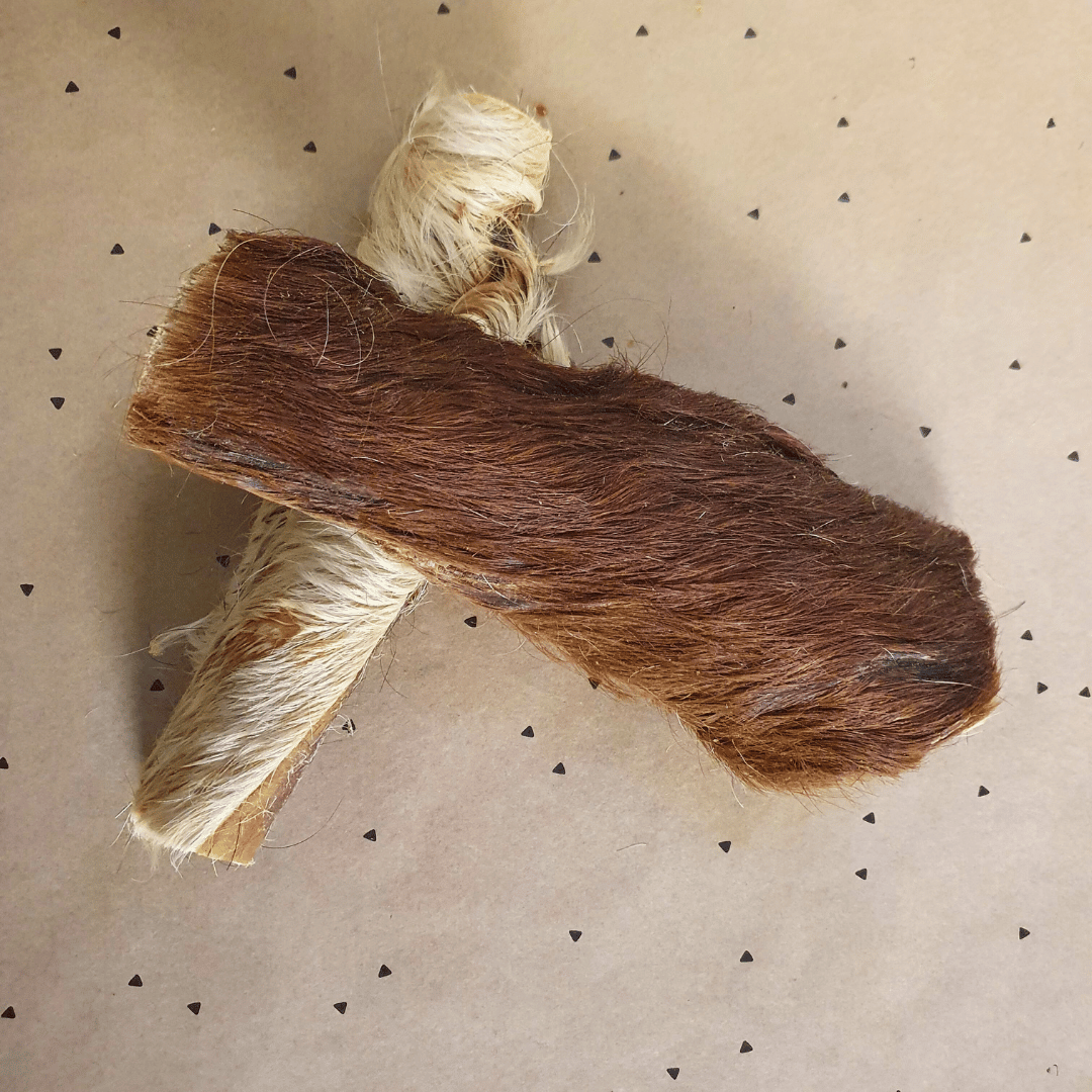 Het unieke van dit product is de natuurlijkheid die wordt getoond door de nog aanwezige vacht. De vacht helpt bij het reinigen van de maag en darmen. Onze volledig natuurlijke Runderhuid met Vacht is ook een populaire keuze voor liefhebbers van het BARF-dieet. In het wild zouden wolven een koe in een wijde vallei vangen en zich voeden met het hele dier, inclusief vacht en botten. Dus onze natuurlijke Runderhuid is een snack die geschikt is voor de soort en de natuurlijke voedingspatronen van de wolf, de voorouder van de hond, weerspiegelt.