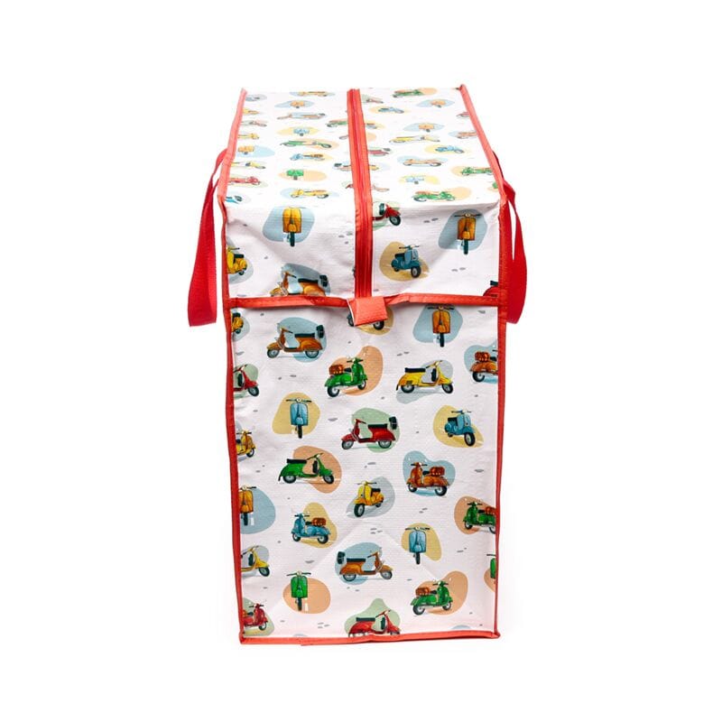 In tegenstelling tot een gewone wasmand is deze tas afsluitbaar, zodat je kleding, speelgoed of strandspullen veilig en stofvrij blijven. Het gelamineerde oppervlak maakt de tas waterafstotend en gemakkelijk met een vochtige doek schoon te vegen; hij is niet geschikt voor de wasmachine, droger, stomerij of strijkijzer. De retro scooter‑print geeft een vrolijke, stoere uitstraling die zowel kinderen als ouders aanspreekt.