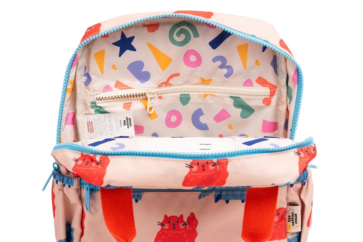 De kinderrugzak meowtiful cats is ideaal voor dagelijks gebruik op school of tijdens uitstapjes. Met een formaat van 24 x 10 x 29 cm biedt hij genoeg ruimte voor een broodtrommel, drinkfles en een knutselwerkje.
